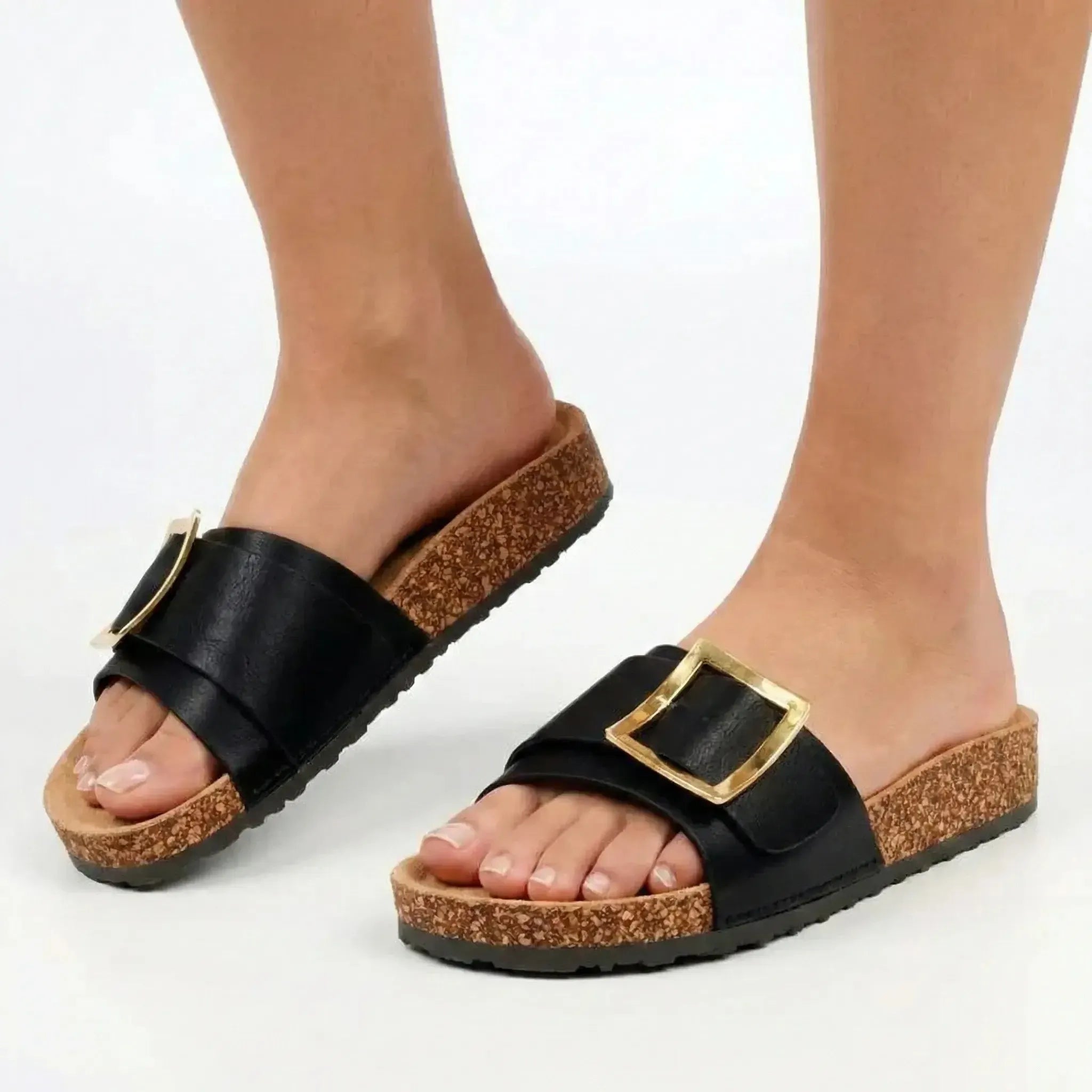 Designed for the modern woman on the go, this slip-on sandal combines a sleek PU upper with a chic buckle trim, offering a perfect balance of comfort and sophistication.