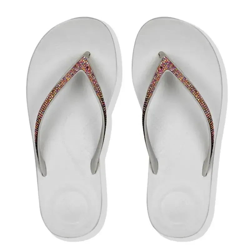 These surfer-girl style flip-flops feature glossy rubber straps embellished with shimmering microโcrystals, set atop FitFlopโs ultra-light iQushionโข air-foam midsole. Underfoot, targeted impact pillows cushion your heel and forefoot, while the anatomical arch contour hugs your foot for supportive alignment.