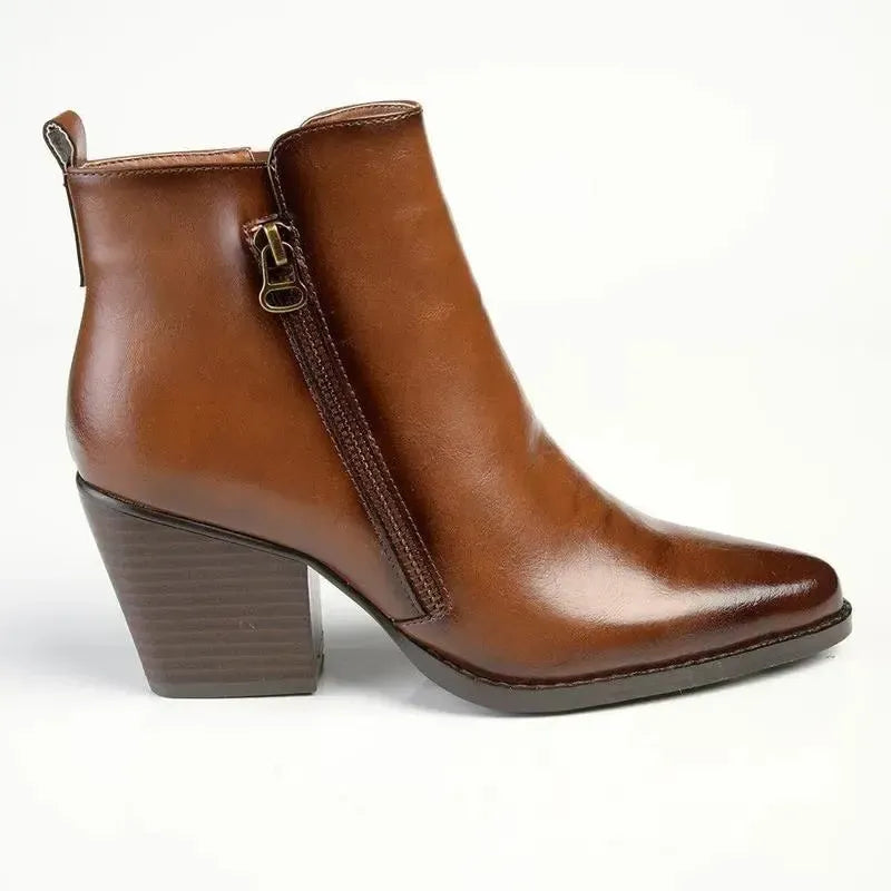Step out in timeless style with this elegant ankle boot, crafted from smooth, polished PU for a refined finish. Designed with a sleek silhouette and a comfortable block heel, this boot offers the perfect balance of sophistication and everyday wearability. The side zip allows for easy on-and-off, making it a versatile choice for both work and casual occasions.