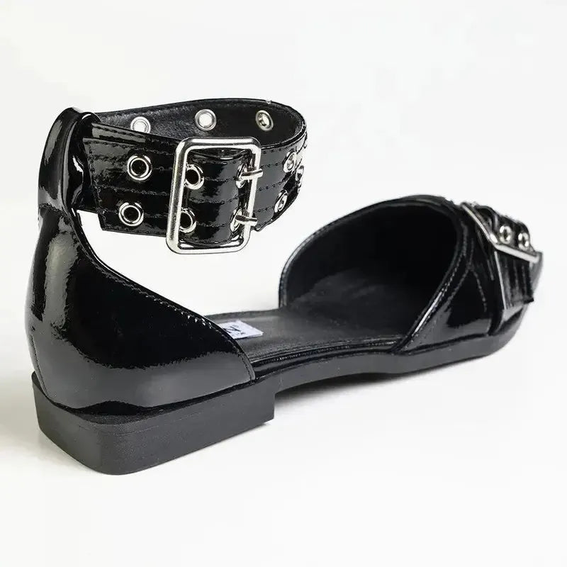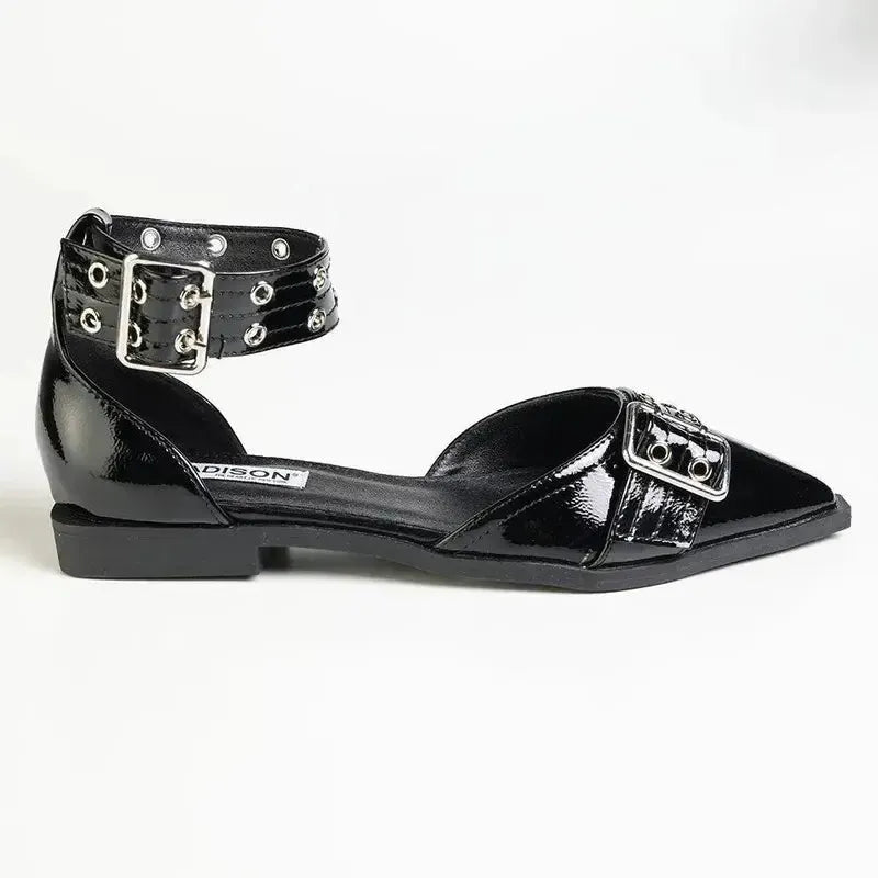 Command attention with the bold and fashion-forward Mallory Eyelet & Buckled Straps Ankle Tie Pump. Crafted in a striking crush patent finish