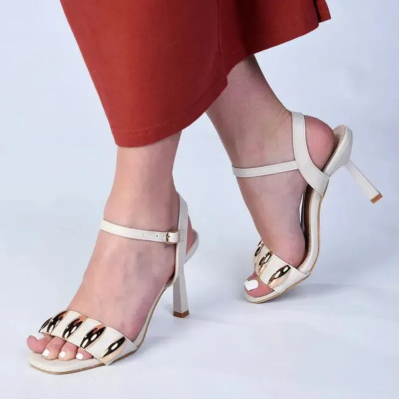 The GLAM you need this summer! Update your summer look in this oval studded footbed sandal heel from Madison!