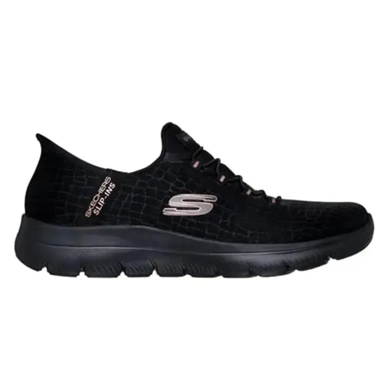 Slip into comfort and style with the Skechers Summits sneaker in black and white. Made with breathable mesh fabric, these shoes are perfect for all-day wear. With a slip-in design, they are easy to put on and take off. Step up your fashion game with these versatile sneakers.