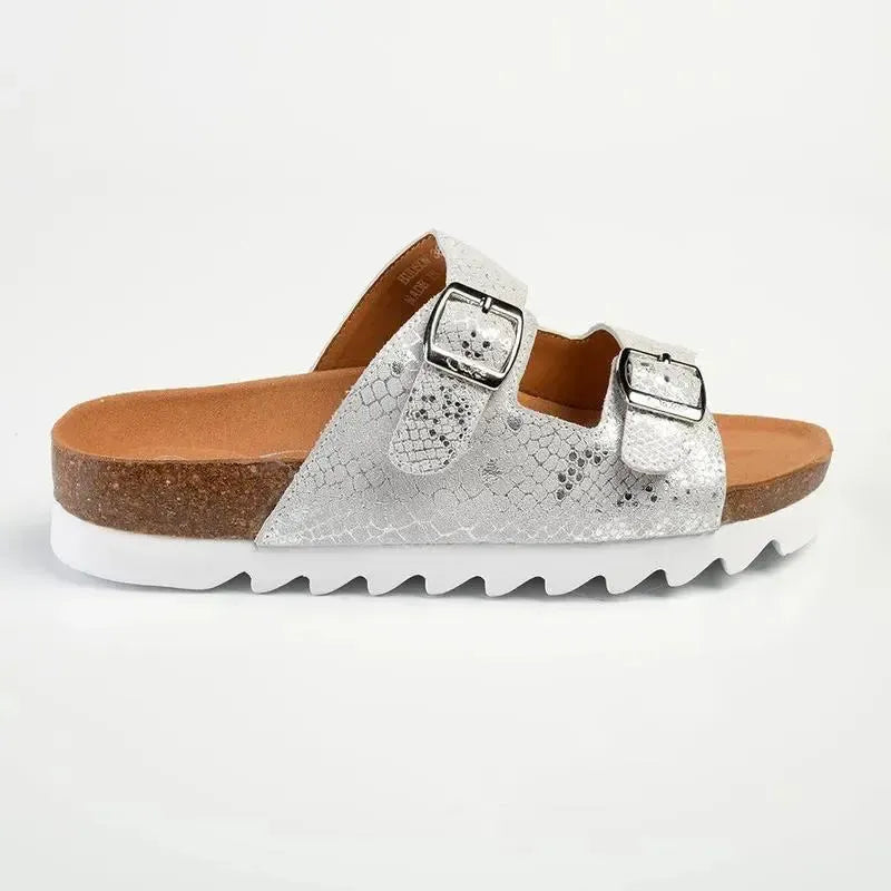 Julz Hudson Leather Double Buckle Footbed Sandal- Silver Snake