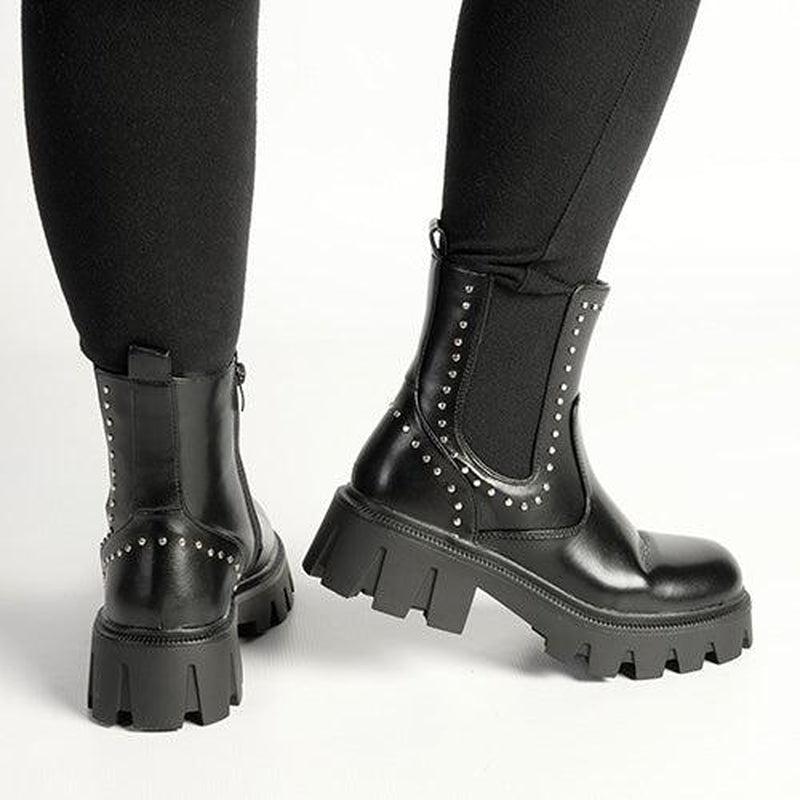 These studded double gusset booties hits on many of this season's hottest trends. Pair with leggings and an oversized top for a casual, comfortable look!