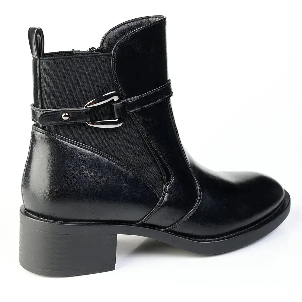 A sleek ankle boot with a classic Chelsea-inspired silhouette. Designed with a smooth, polished upper and elastic side panel for easy on-and-off wear. The low block heel provides comfort and stability, while the subtle buckle strap detail adds a modern, stylish touch. Ideal for everyday wear, work, or smart-casual outfits.